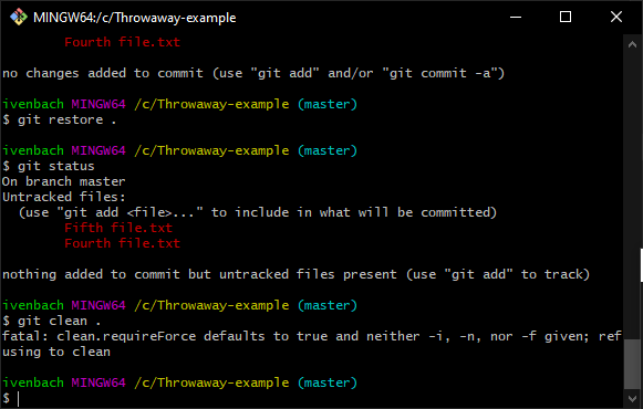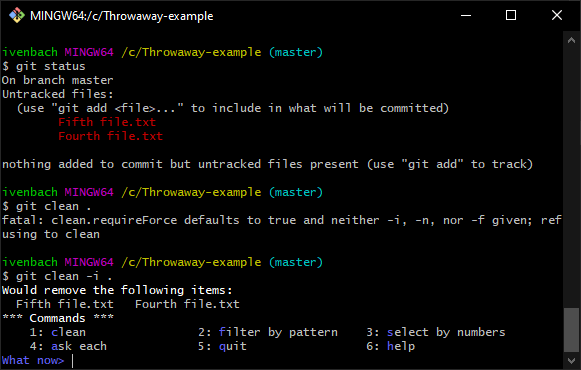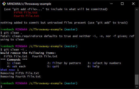 . As before I watched the directory while I executed the command. Nothing happened. Confused, I then saw the output "fatal: clean.requireForce...".